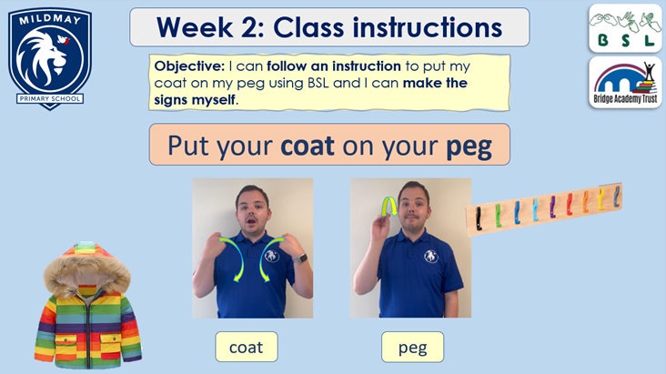 Each week children are shown PowerPoint slides introducing a new BSL objective and modelling how to sign the new vocabulary.