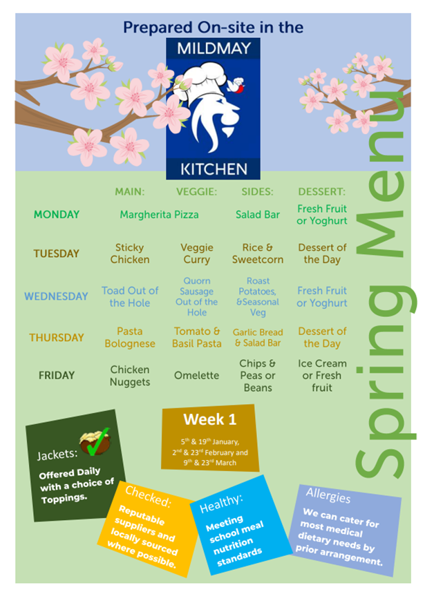 School meals at Mildmay Primary School are prepared daily onsite by our catering team.